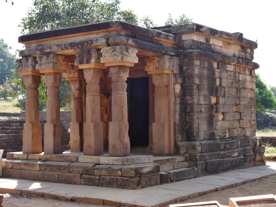 Za nejstarší prototyp hinduistického chrámu je považován jednoduchý a dobře zachovalý chrám číslo 17 v areálu v Sáňčí (Madhjapradéš)[7], datovaný kolem roku 415 (obr. 1). Je to přízemní stavba s plochou střechou, vztyčená na nízkém kamenném soklu (adisthana). Dnes už chybějící idol na oltáři uvnitř byl obestavěn čtvercovou svatyní (garbha) a sloupovou předsíní (antarála). Garbha samotná je zcela bez oken, jediné světlo vniká dveřním otvorem, rámovaným pilastry. Čtyři sloupy antarály jsou monolitické. Jejich průřez, který zdola přechází ze čtverce a osmiúhelníku až do svisle rýhované ozdoby tvaru obrácené nádoby, je typický pro raný indický středověk. Bloky nad sloupy jsou reliéfně zdobeny lvíčky v nárožích.[8] Jiný chrám v obci Bhumara (Madhjapradéš) má už adisthanu vyšší se schodištěm.