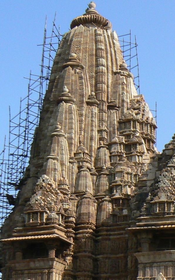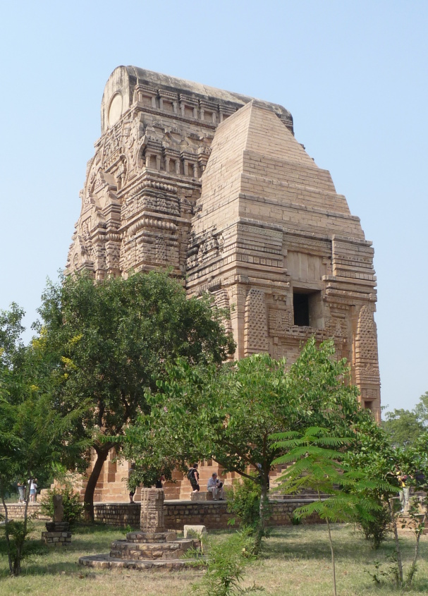 Na konci 5. a v první polovině 6. století, tedy v závěru vlády Guptovců, se pravděpodobně vyvinul tvar severoindické chrámové věže, která bývá vztyčena nad půdorysným čtvercem garbhy, aby zvýraznila její polohu při pohledu zvenčí. Jednou z inspirací mohl být buddhistický chrám Mahabódhi v místě Buddhova osvícení v Bódhgaji (Bihár): na plaketě datované mezi léta 150-200 je patrné, že měl už tehdy věžovitý tvar.[9] Jeho dnešní tvar jehlanovité věže pochází až z guptovské přestavby v 5. nebo 6. století. Ve stejném období lze dokumentovat první snahy o věžové nástavby hinduistického chrámu.[10] Ojedinělý doklad guptovského chrámu v Poganží stojí v Bhitargaonu (Uttarpradéš) – i v dnešní fragmentárně dochované podobě má výšku 21 metrů. To je úctyhodné tím spíše, že jde o stavbu nikoliv kamennou, nýbrž cihlovou, původně obloženou terakotovými panely, tedy materiály v architektuře Guptovců velmi oblíbenými a v Poganží snadno dostupnými. Jiný zárodek věžové nástavby nalezneme v Deogarhu (Madhjapradéš). Asi nejstarší lépe dochovaná ukázka věže severoindické chrámové věže (šikhara) je v Lakšmanově chrámu v Sirpuru (Čhattisgarh)[11], z něhož se zachovala právě jen věž nad garbhou (obr. 2). Hrany a stěny jeho věže se s rostoucí výškou zaoblují směrem ke středu, což je typické právě pro vzhled klasické severoindické šikhary. Výzdoba šikhary v Sirpuru je velmi dovedně vyřezána do pálených cihel a nepřehlédneme v ní (v indickém umění už tehdy dávno zdomácnělý) motiv slepého okna podkovovitého tvaru (gavakša), který se mnohokrát opakuje na všech čtyřech stranách věže. I samotné hrany věže jsou změkčeny zaoblením tak, že jsou do nich periodicky vloženy svisle rýhované disky (amalaka).