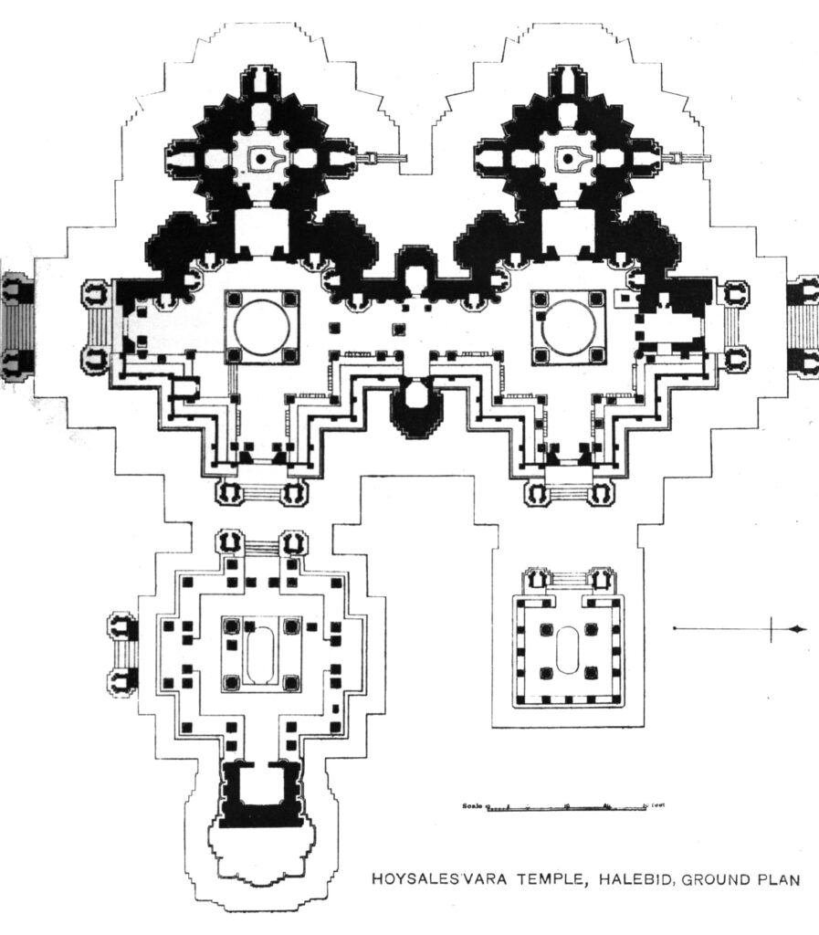 Unikátní půdorysné řešení nalézáme v Hójšaléšvarově chrámu v Halebídu (obr. 13). Hlavní hójšalský chrám z 12. století je totiž koncipován jako dva zcela totožné chrámy, usazené na společnou terasu džagati. Příčné transepty obou mandap jsou navzájem propojeny a rozšiřují vnitřní prostor. Různá velikost obou samostatně ležících protilehlých Nandího mandap je jediným rozdílem mezi chrámem krále Višnuvardhany, tj. Hójšaléšvarovým (vlevo), a královny Šantaly Déví, tedy Šantaléšvarovým (vpravo).