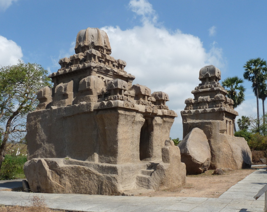 Významný vládce tamilské dynastie Pallavů Mahéndravarman I. na konci 6. století zavrhl netrvanlivé cihly a dřevo jako nevhodné pro stavbu chrámů a upřednostnil svatyně tesané v rostlé skále.[12] V pallavském přístavu Mahábalipuram na něj navázal král Narasimhavarman I. (vládl v letech 630-668) budováním dalších jeskynních chrámů, ale především i monolitických struktur. V obou případech kameník odstraňuje části skály; nabízí se paralela jeskyní a monolitů s negativem a pozitivem, tvarosloví vytesaných objemů se ovšem liší. V pallavském umění se monolitickým chrámům říká rathy.[13] Některé rathy ve skupině Pidari (obr. 3) jsou tak malé, že se do nich nedá vstoupit, i kdyby byly dokončené s dutinou garbhy. Podstatný je však fakt, že jsou na nich plně vypracované pyramidové střechy s hluboce prolamovanými patry, v nichž se ve zmenšení opakuje tvar chrámu, především oné kamenné helmice z vrcholu střechy. To jsou prototypy jihoindické chrámové věže (vimány), vztyčené stejně jako na severu nad čtvercovou garbhou. Ve slavném souboru Pěti rath v Mahábalipuramu reprezentují vimány většího měřítka chrámy Ardžunův a Dharmarádžův. K volně stojící architektuře stavěné z kamenných bloků dospěli Pallavové v první čtvrtině 8. století: vimány obou svatyní Pobřežního chrámu pokračují ve stylu střech monolitických rath, ale zeštíhlují se.[14] V jediné lokalitě Mahábalipuram tak z poguptovského období nalezneme unikátně pohromadě nejen umělé jeskyně a monolitické chrámy, ale i volně stojící chrámovou stavbu. Navíc Pallavové zde přinášejí do tamilské architektury ještě druhý typ chrámu: Ganéšova i Bhímova ratha mají obdélný půdorys s válcovým zastřešením, které tvarem obráceného lodního kýlu připomíná stropy buddhistických jeskynních svatyní čaitja. Kdyby nešlo o monolitické výtvory, řekli bychom, že jsou zastřešeny valenou klenbou. Od poloválcového zastřešení garbhy se později ustoupilo, ale tento typ střechy v chrámové architektuře jihu našel další využití jako „věž nad branou” (gópura) s průchodem do chrámového okrsku v čólských chrámech 11. století.