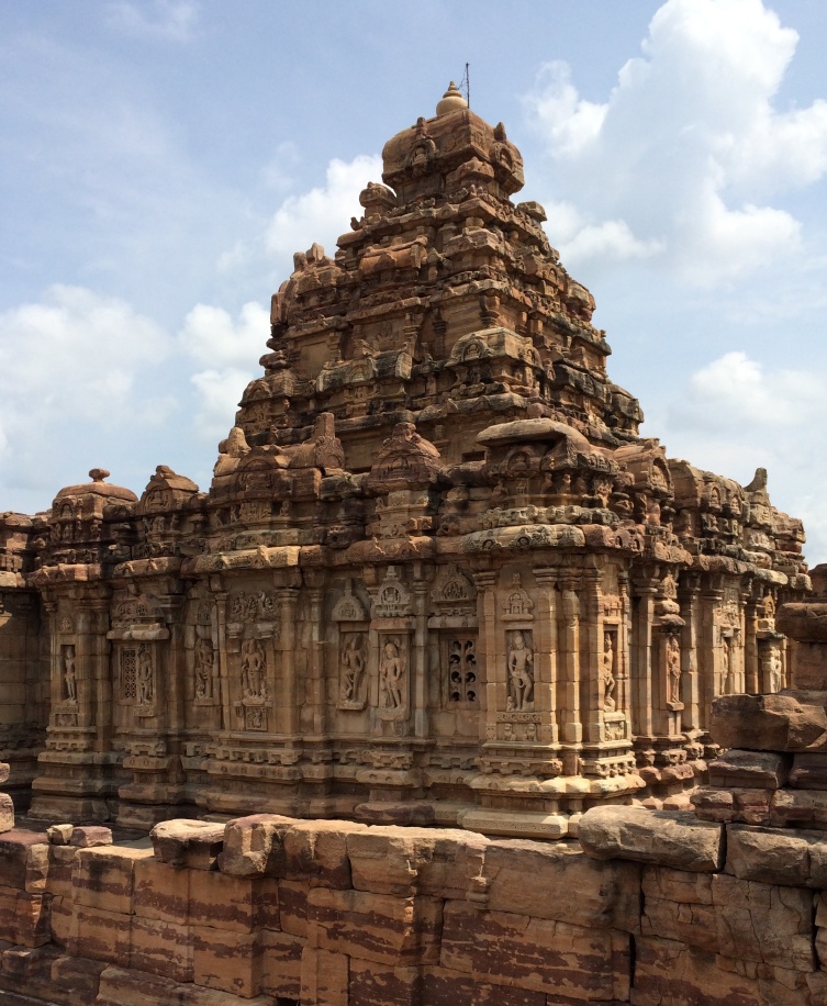 Také vládci dynastie Čálukjů v severní Karnátace začali ve druhé polovině 6. století budovat ve svém sídelním městě Badámí nejprve tři velké jeskynní chrámy. V 7. století už přešli k volně stojícím chrámovým stavbám (Dolní Bhutanáthův chrám, tři chrámy s názvem Šivalája); vimány těchto chrámů nemají tak výrazně prolomené horizontální vrstvy ani tak dominantní helmice jako pallavské vimány. Na konci 7. a během 8. století dokonce staví Čálukjové v nedalekém Pattadakalu několik chrámů se severoindickou šikharou (např. chrámy Džambulingův a Galaganáthův)[15], ovšem současně s tím i větší chrámy s vimánami pallavského typu (chrámy Mallikardžunův a Virupákšův, obr. 4), datované do 40. let 8. století.[16] Přenos a šíření architektonických typů mezi jednotlivými regiony nepochybně urychlovaly vojenské výpady, kdy vítěz si přivezl zpět umělce ze dvora poraženého soupeře – morfologické příbuznosti a časové posloupnosti vimány Kailasanáthova chrámu v pallavském sídelním městě Kánčípuramu, Virupákšova chrámu v čálukjovském Pattadakalu a Kailasanáthova chrámu v ráštrakútské Ellóře (Maháráštra) si povšimla řada badatelů[17]; můžeme si je tak dát do souvislosti s obsazením Kánčípuramu Čálukjovci v roce 742 a vojenskou anexí čálukjovského panství Ráštrakúty v roce 753. Pattadakal se tak stal jediným místem v celé Indii, kde vedle sebe najdeme chrámy severního slohu se šikharou a jižního slohu s vimánou ze stejné doby.