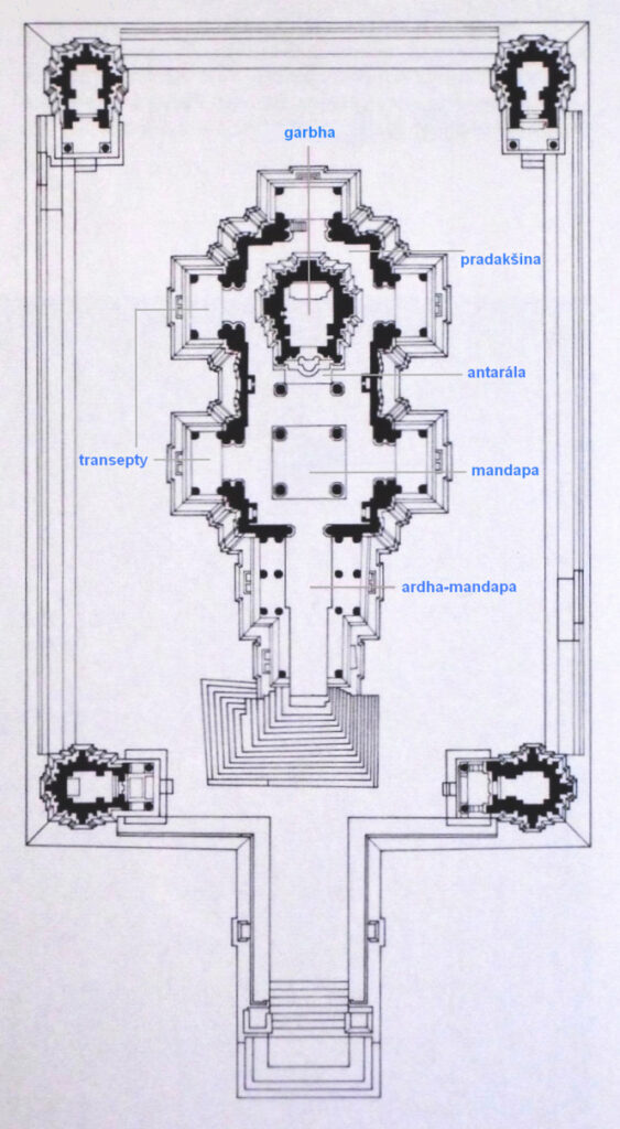 V exteriéru byl chrámový okrsek vymezen obdélným hrazením (prakara) s branou (tórana) v hlavní přístupové ose, případně branami v osách stran hrazení. U velkých chrámů byly zřizovány pobočné chrámy buď v chrámovém nádvoří anebo na samotné adisthaně. Typickou formou takto izolované stavby jsou chrámky zasvěcené jízdnímu zvířeti (vahana) božstva hlavního chrámu, tedy býka Nandího v případě Šivy nebo některého z avatárů Višnua. Takové svatyně bývají většinou stavěny jako mandapy, tedy sloupové pavilony s otevřenými stěnami, ale vždy na hlavní ose proti vchodu do chrámu. Tento koncept se s hinduismem rozšířil do jihovýchodní Asie, krásným příkladem je areál chrámu Lara Džonggrang v Prambananu na střední Jávě (9. stol.).[20] Jinou formou pobočných chrámů je uspořádání 1+4 (pančajatana), tedy čtyři pobočné chrámky v rozích prakary nebo adisthany. Prakticky vždy jde o zmenšeniny tvaru hlavního chrámu. Nejzachovalejší pančajatanou středověku je Lakšmanův chrám v Khadžuráhu (Madhjapradéš) z 10. století (obr. 5). V tomto období zdomácněl typ pančajatany i v khmerské říši, například v „chrámu-hoře” Phnom Bakheng v Angkoru.[21]