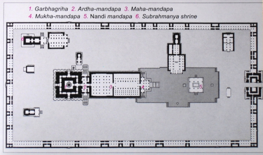 Na jihu v období 10. – 11. století dominovali v chrámové výstavbě tamilští Čólové. Pallavský koncept vimány zvýšili až na 63 metrů, byť s méně dynamicky oddělenými patry, zato s nepřehlédnutelnou helmicí (v Brhadíšvarově chrámu v Tančavúru monolitickou o hmotnosti 81 tun). K dalším typickým prvkům vrcholných čólských chrámů patří vstupní gópura v mohutném obdélném hrazení s nepřerušově probíhající sloupovou verandou na vnitřní straně (obr. 7), ve výzdobě například monumentální figury ochránců vchodů (dvarapálové).[25] Ve 12. a 13. století pak ještě do architektury jihu promluvili Hójšalové v Belúru, Halebídu a Somnáthpuru (jižní Karnátaka) s hvězdicovými půdorysy diagonálně otočené mandapy i garbhy (obr. 13), kopírovanými širokou nekrytou terasou (džagati) pro pradakšinu, a přebujelou ornamentální výzdobou včetně unikátně soustružených sloupů.