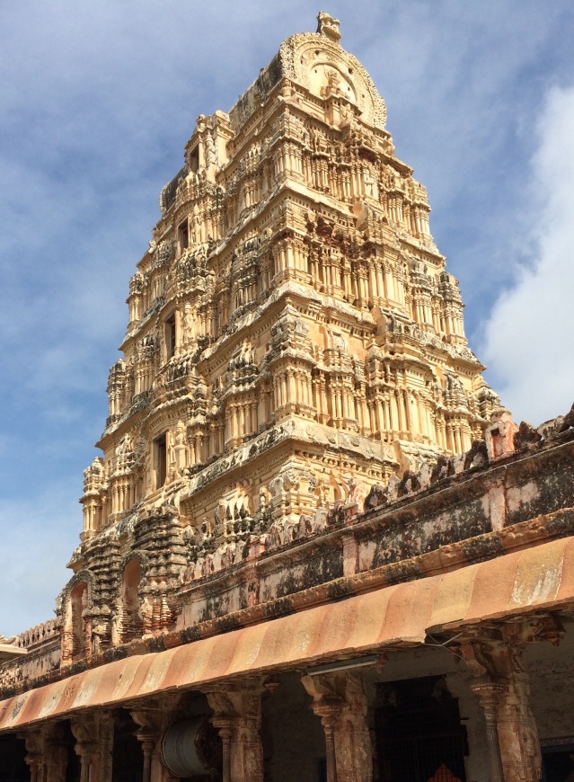 52 metrů[26], obr. 8) a po zániku této říše v 16. století jsou čím dál nižší jihoindické vimány ve velkých areálech často rozpoznatelné jen podle pozlacené střechy. Novým fenoménem 16. a 17. století se ve stále hinduistickém Tamilnádu stal „chrám-město” – k velkým chrámům se přistavovala další a další koncentrická pravoúhlá hrazení s mnoha vysokými gópurami. Prostor mezi hrazeními byl postupně zastavěn, takže lze hovořit o jakémsi chrámovém urbanismu. Největší „chrám-město” Šrírangam u města Tiruččiráppalli má na ploše 63 hektarů sedm hrazení s celkem 21 gópurami. Pro cirkulaci rostoucího počtu věřících v „chrámech-městech” se budovaly dlouhé rovné chodby, v Raméšvaramu dosahující celkové délky 1175 metrů, pro odpočinek poutníků slouží tzv. Síně tisíce sloupů, bohatě sochařsky zdobených (např. chrám Minakší v Madurai má sloupů „pouze” 985).